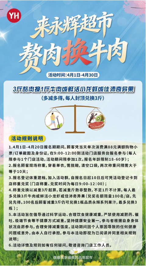 比年来,“减重热”在宇宙悄然兴起,但这几天,大家奔向的不是健身房,而是永辉超市。跟着“每减重3斤,即可兑换1斤牛肉或小龙虾”的音信在应答平台刷屏,这场被网友戏称为“《西虹市首富》照进施行”的道理四肢,赶紧烽火了市民的参与热诚。从4月1日开动,这一兼具道理与温煦的四肢在永辉宇宙门店络续上线,记者获悉,上海统统永辉超市门店均可参与本次四肢,4月1日到20日为报名期,报名后10天可称重兑换。