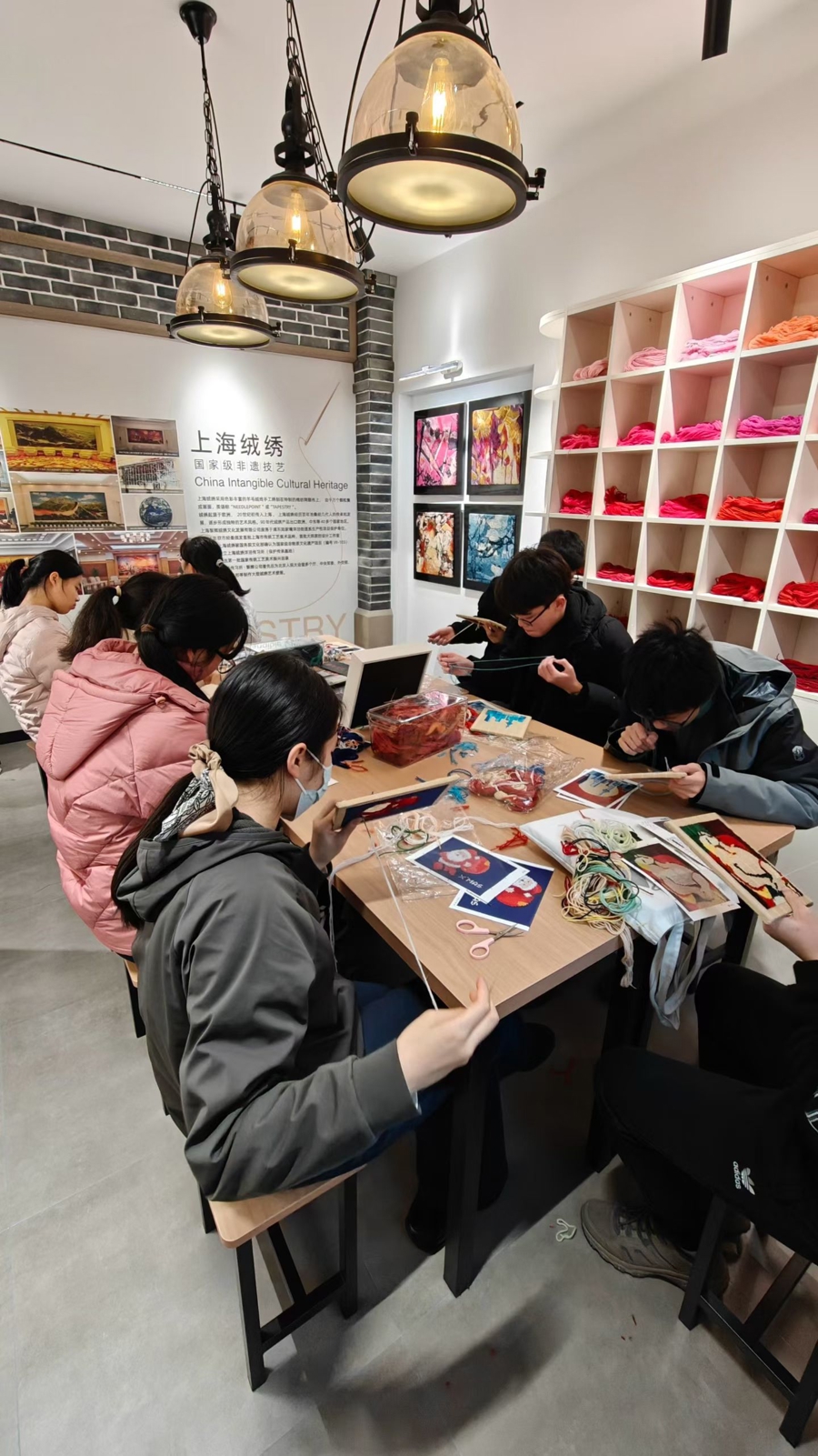 上海绒绣有“东方油画”之誉,是用彩色羊毛绒线在特制棉纺网眼麻布上绣制的手工艺品,具有色彩浓郁、立体感强的特点。19世纪末20世纪初,绒绣从欧洲传入中国,20世纪以后,绒绣在上海开始发展与创新之路。作为大型艺术壁画,绒绣还具有不反光、吸音的特性,远观如天地画卷徐徐展开,近赏见万缕绒绣交织,色彩在光影中流转,形成独特的复色艺术效果。