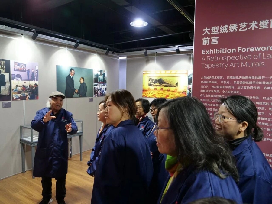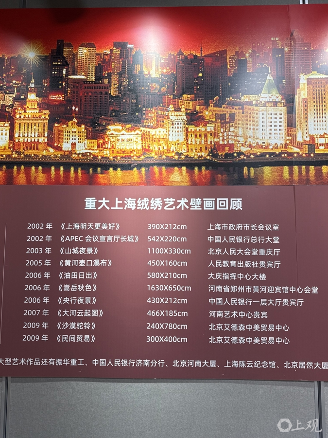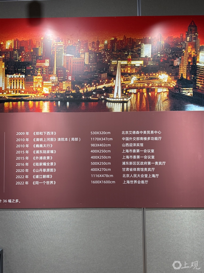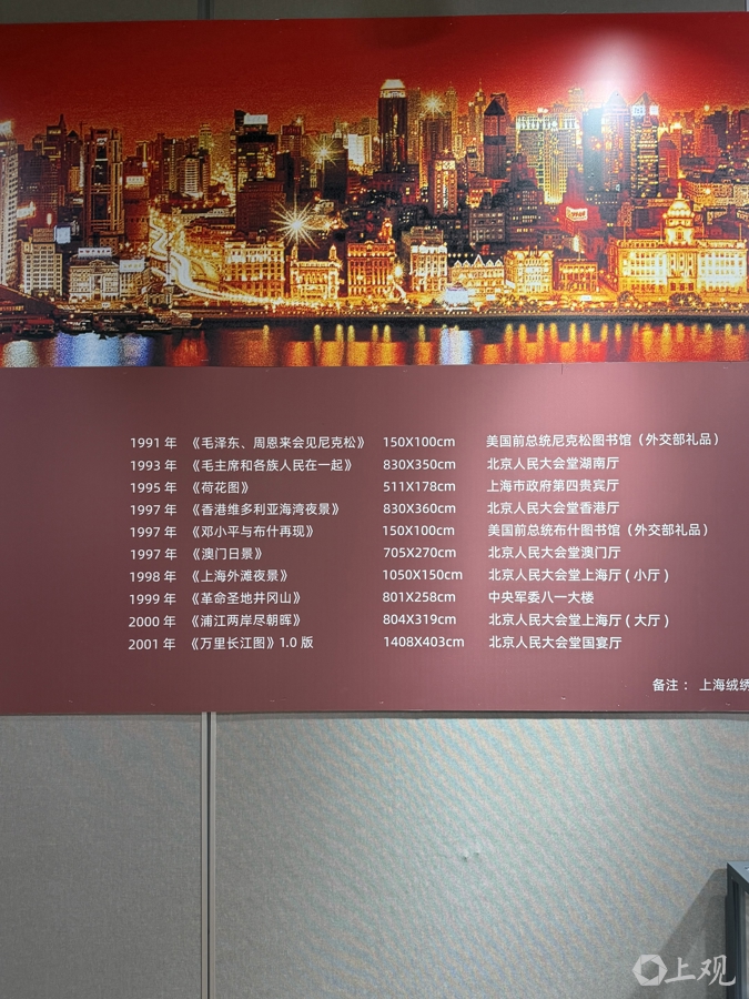 在《上海绒绣·大不里士波斯毯非遗文明对话》暨大型绒绣艺术壁画作品回顾展上,有一面“重大上海绒绣艺术壁画回顾”统计墙,从1991年作为外交部礼物赠送给美国前总统尼克松图书馆的《毛泽东、周恩来会见尼克松》开始,包炎辉团队完成的大型绒绣壁画有近30幅,最近一幅是2022年完成的悬挂于上海世界会客厅的《同一个世界》。人民大会堂上海厅的《上海外滩夜景》《浦江两岸尽朝晖》,重庆厅的《山城夜景》,澳门厅的《中西荟萃·澳门之夜》等,都是巨幅上海绒绣。河南郑州黄河迎宾馆中心会堂里的《嵩岳秋色》是其中最大一幅,面积达106平方米。