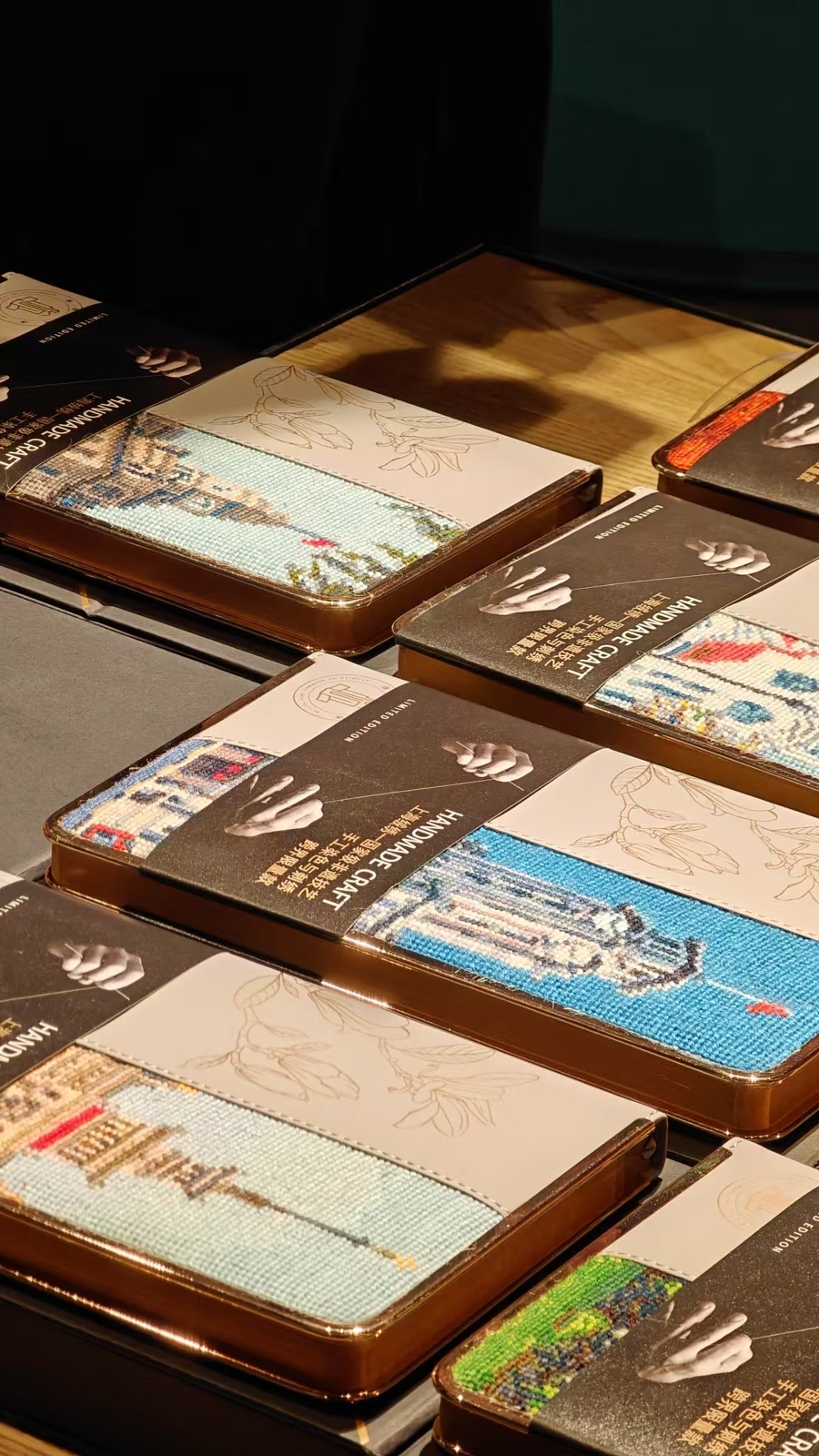 “绒绣作品成本高,价格居高不下,手工艺人青黄不接。我对爸爸说过最难听的话是:绒绣没有希望了。”包炎辉的儿子包粒曾是一名广告人,现在是父亲的亲密工作搭档。作为设计师的他力图让绒绣从画框走进生活,特别是年轻人的生活里,将绒绣与家具、雕塑、椅子、服装,鞋类甚至潮玩融合创作,前两年开发的一款《一路繁花》笔记本,用绒绣呈现白玉兰图案和上海优秀历史建筑面貌,受到茑屋书店等合作方的青睐。