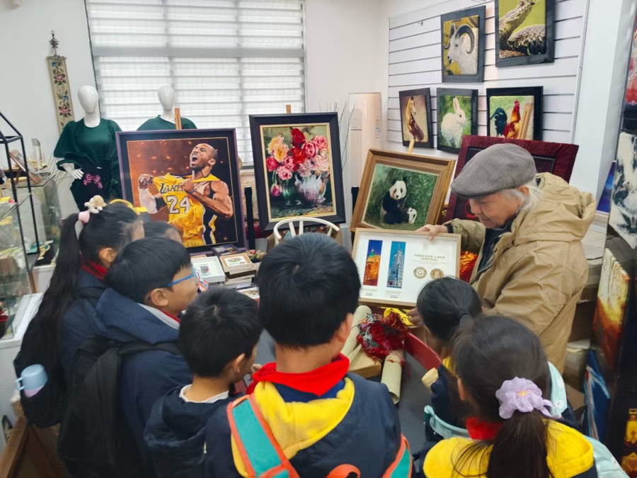 包炎辉向小学生介绍上海绒绣。受访者提供