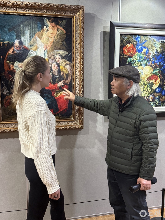 上海绒绣市级非遗传承人包炎辉为参观者介绍作品。施晨露摄