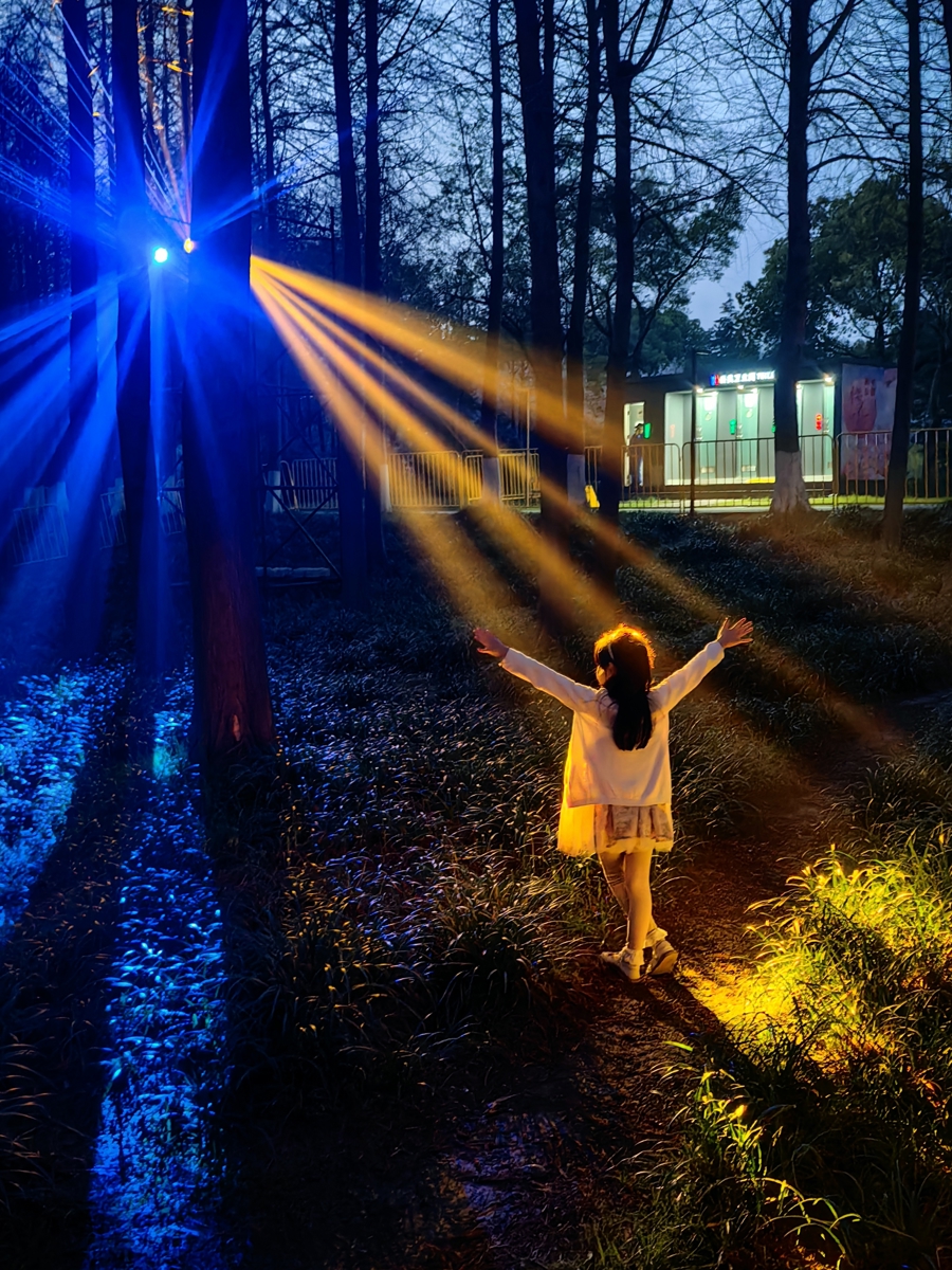 春夜童话 | 夜色中,顾村公园丛林里的“丁达尔”光影给搭客带来虚幻的千里浸式体验。小女孩犹如踏进于童话秘境 杨建正 摄