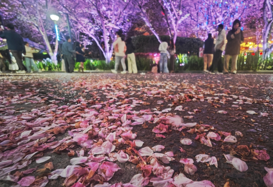 春径落英 | 这两日,轨交8号线虹口足球场站旁的樱花林迎来了一场正式的花瓣雨。路面被飘落的花瓣掩饰,宛如铺了一条绵软的粉红色地毯。在夜晚灯光的照射下,花径如梦如幻,好意思不堪收 新民晚报记者 陶磊 摄