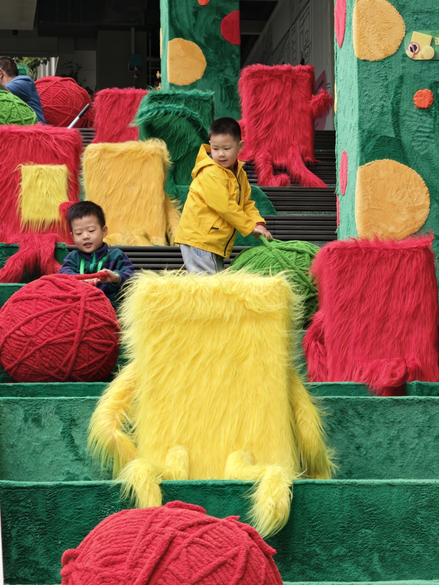 春色律动 | 上生•新所充满童趣的艺术互动装配色调昭着,孩子们在这里寻找春日元素 新民晚报记者 刘歆 摄