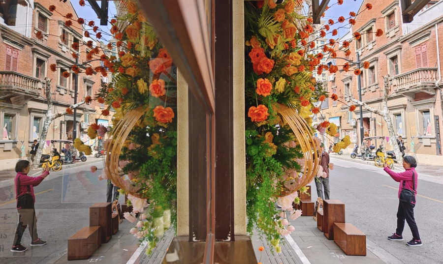 春日花街 | 花瀑垂门,花境铺巷,花枝绕窗……跟着2026上海海外花草节周边,黄浦区淡水路已完成春日花草叮咛。市民闲庭信步、赏花寻香或安身沿街小店,感受历史街区的诗意更新与社区活力 新民晚报记者 刘歆 摄
