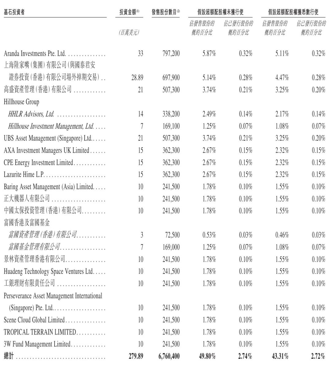 其中,Aranda Investments认购3300万好意思元,上海陆家嘴(集团)有限公司(与国泰君安证券投资(香港)有限公司场外掉期往返)认购2889万好意思元,高盛财富搞定(香港)有限公司认购2100万好意思元;