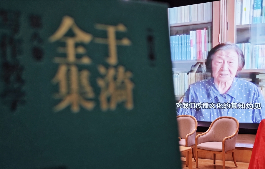 2023年,《于漪全集》(纠正版)首发式上,播放于漪浑厚视频谈话 影相:陶磊