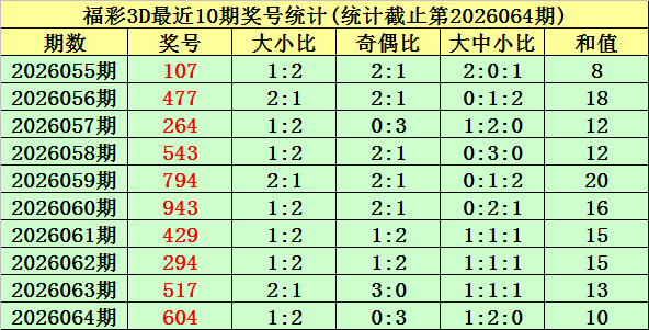 开奖转头:福彩3D第2026064期奖号为:604。奖号类型为组六,和值为10,奇偶比为0:3,跨度为6,012路比为2:1:0,大小比为1:2。