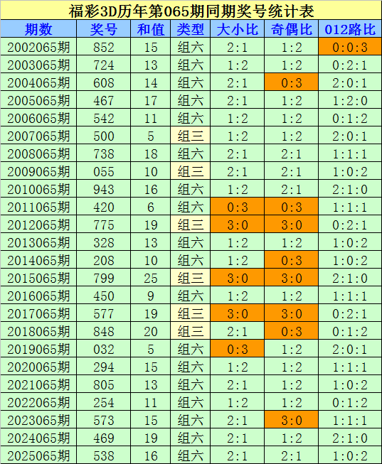 组选类型判断:在第065期历史同时开奖中,组六开出18次,组三开出6次,本年同时看好开出组六号码。