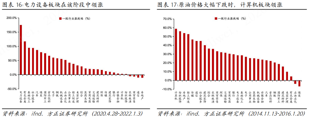 当油价从80-100区间下落至80好意思元以下时,TMT板块仍然推崇相对较好。2018年跟随特朗普在进取台,国外买卖争端升级,各大机构下修经济增长预期;此外,10月好意思国片刻豁免对伊朗的制裁,重迭各大产油国捏续增产,油价在站上80好意思元/桶的关隘后11天达到85好意思元/桶的阶段高点,随后再度迈入下落通说念。2020年3月“OPEC+”未能就进一步减产已毕一致,沙特实施错误性增产,重迭疫情扰动寰球经济分娩活动,原油需求大幅下滑,供给增多与需求的下降共同带动原油价钱大幅下滑。在此时刻,受益于国产替代、自主可控的预期升温,新动力汽车产业趋势的不断演绎,以TMT和电力设备板块为代表的成长作风推崇相对较好。