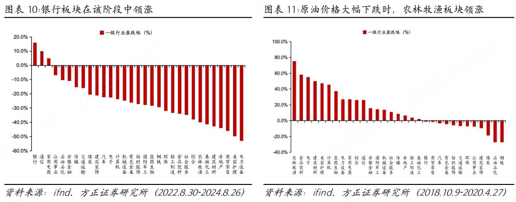 油价在100好意思元/桶及以上时,概略对应两个典型时刻:2011年1月至2014年9月、2022年2月至2022年8月。油价初度碎裂100好意思元/桶并上升至最高点时刻,阛阓主要交游滞胀。自最高点初度回落时,通胀受益板块迎来补涨。当油价再次反弹时,阛阓对通胀交游明锐度下降,部分产业相比上风较大的成长板块会迎来反弹,如11-14年的TMT、2022年的电力设备和汽车。当油价步入下落通说念并跌破100好意思元/桶的关隘时,成长作风迎来领涨。