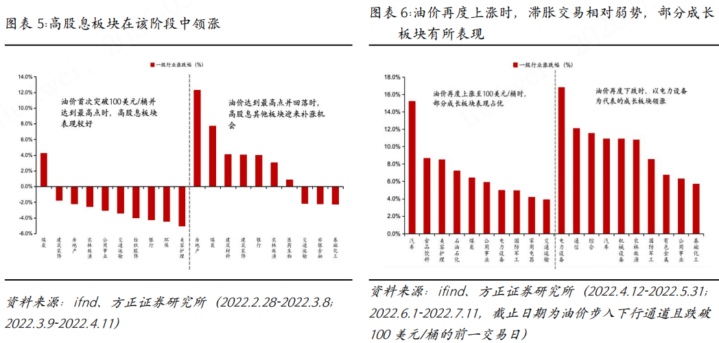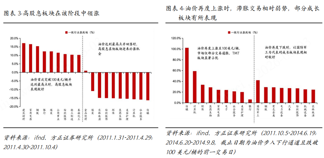 2010年底,地缘政事推升油价快速上行,并于2011-2014年9月捏续处于高油价水平。好意思国开启QE2,重迭“阿拉伯之春”、利比亚内战等地缘冲突,油价捏续冲高,于2011年1月31日初度碎裂100好意思元/桶,达到101.01好意思元/桶,最终在4月29日达到最高点125.89好意思元/桶。在初度碎裂100好意思元/桶并达到最高点时刻,GDP当季同比增速从两位数下滑至个位数,CPI碎裂5%,建筑材料(+17.0%)、家用电器(16.5%)、钢铁(+15.3%)、银行(+12.3%)、煤炭(+12.3%)等高股息板块推崇较好。随后在油价初度回调时,阛阓仍然聚焦于高油价带来的通胀交游,食物饮料、煤炭、农林牧渔等前期涨幅过期的高股息迎来在该阶段中推崇相起义跌。而在油价再度上升时,阛阓对通胀交游的明锐度大幅下降,TMT板块权臣占优。