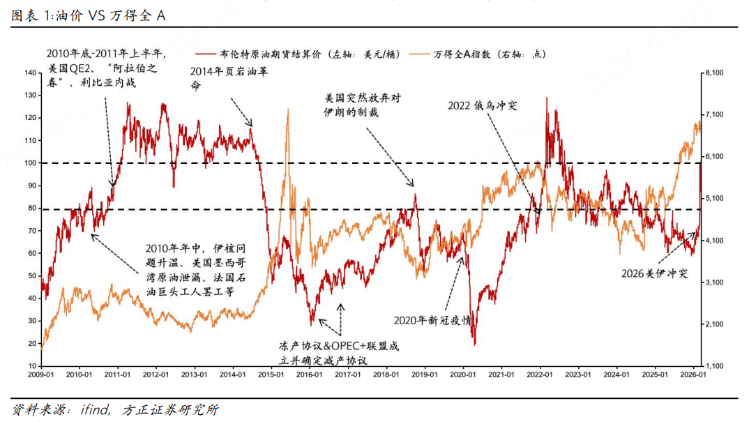 回归2009年以来的油价变化,大体不错分为100好意思元以上,80-100好意思元以及80好意思元以下三个区间。当原油价钱大于100好意思元/桶即处于高油价时刻时,A股阛阓多数推崇较弱,如2011年2月至2014年6月与2022年2月至2022年8月。