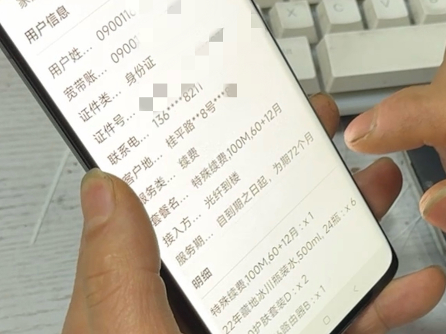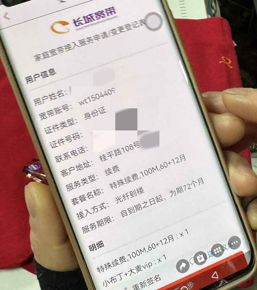 顾先生向记者出示办理的长城宽带套餐。