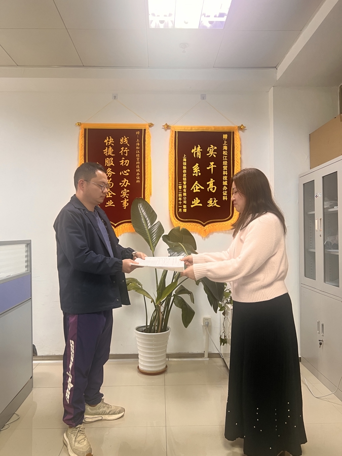 “底本觉得办证要我方去市里跑,没念念到乐民公司办证科责任主谈主员免费提供一站式服务,咱们只需要提交材料,3个责任日内就领到了贸易牌照,高效!”拿到清新的贸易牌照后,落户松江经开区的松江国和经彩智造创业投资结伴企业有关庄重东谈主不禁为经开区乐民企业服务有限公司(简称“乐民公司”)办证科责任主谈主员竖起了大拇指。