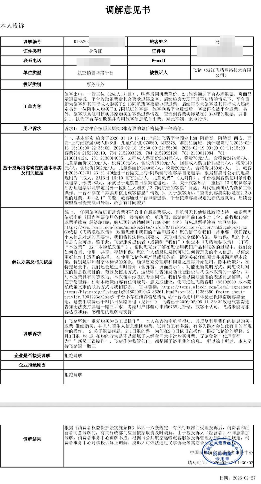 汤先生称已告状飞猪平台,当今案件气象为“待审核”