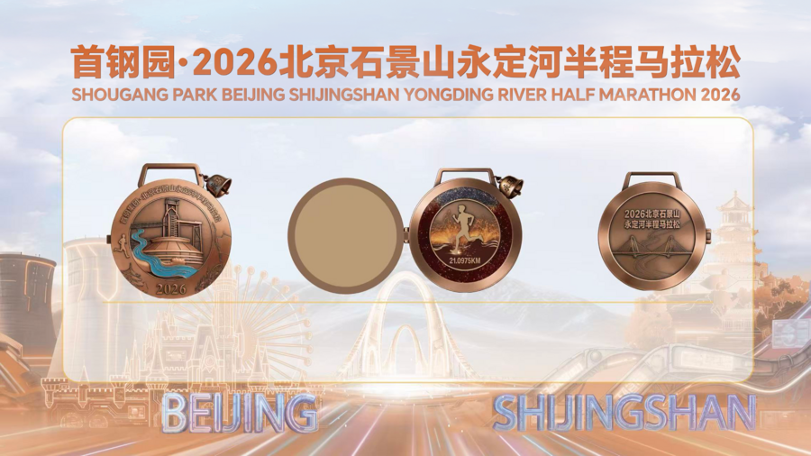 奖牌正面外圈精确复刻首钢三高炉标志性空洞——这座中枢工业遗存承载着百年工业回归与城市转型奋进精神;内层特设跑者流沙动态规画,流沙随奖牌晃动而流动,勾画出跑者极力驰驱的灵动姿态,象征每一步坚执都汇注成荣耀。奖牌后面完好呈现首钢大桥大气空洞,永定河水从中间穿过,畅达的线条寓意驰驱之路一往无前。
