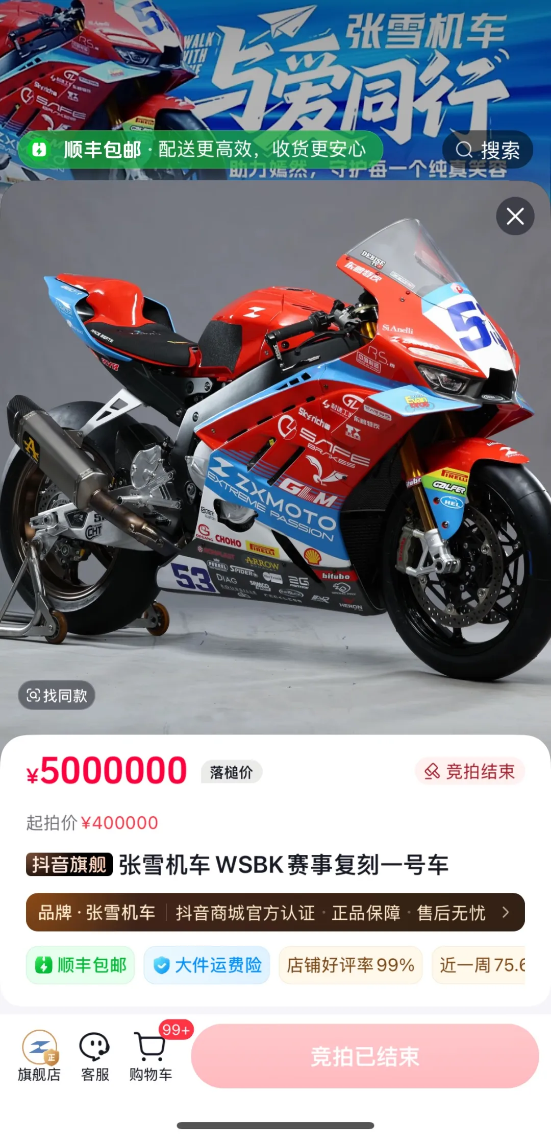 4月10日晚7点48分,@张雪机车“WSBK夺冠赛车复刻版线上拍卖会”开播,直播间一会儿挤入上万名网友,弹幕刷屏。