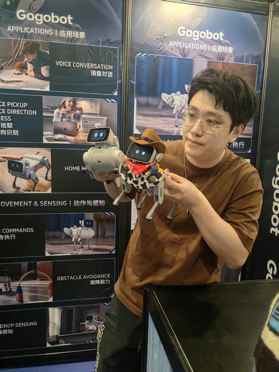与“众人伙”在总共比快比高不同,gogobot labs公司带来长25厘米、高19厘米的AI跟随机器狗“gogo”。与多数机器狗用在工业鸿沟不同,“gogo”成见是走入家庭。在现场,小家伙与买家聊了起来。“咱们对它的‘东谈主设’是爱吃垃圾食物的小胖子,可爱和主东谈主撒娇卖萌。”家具司理王汝岱告诉记者,它不错用15钟话语与东谈主对话,既能匡助老东谈主排遣一身,也能和孩子玩单词拼写和数学经营,现在预售价239好意思元,主打泰西商场。